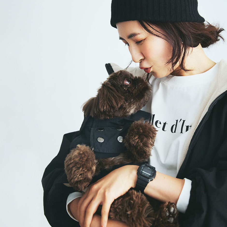 ニュアンスおそろいコーデでなかよく愛犬とのお散歩時間を楽しめます。