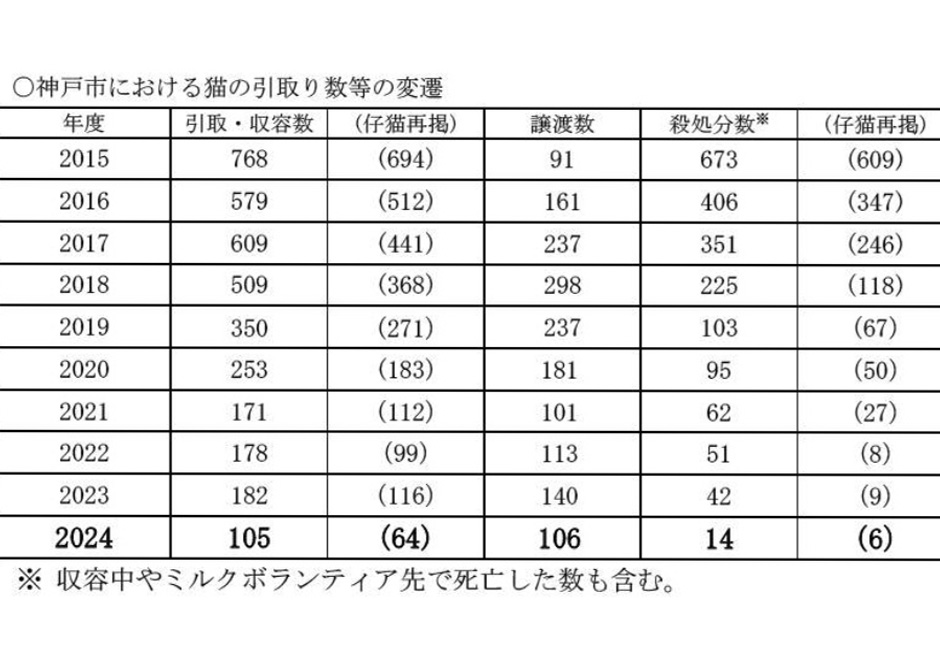 その甲斐もあり、神戸市における猫のさつ処分は、2015年度に673匹だったのが2024年度は14匹にまで激減しています。※