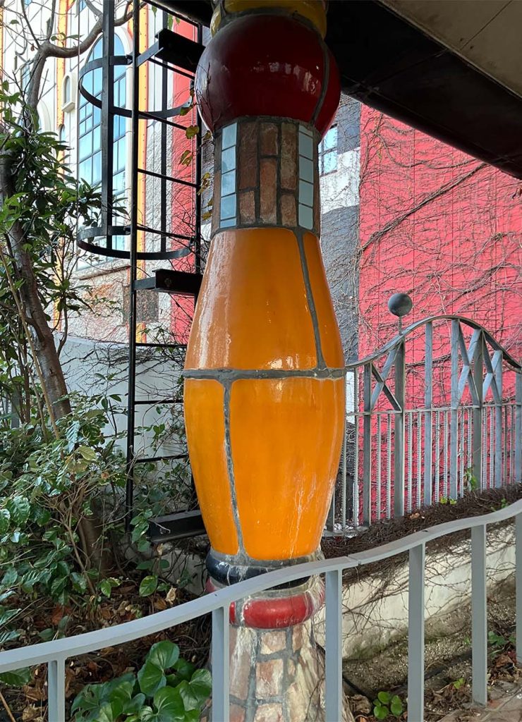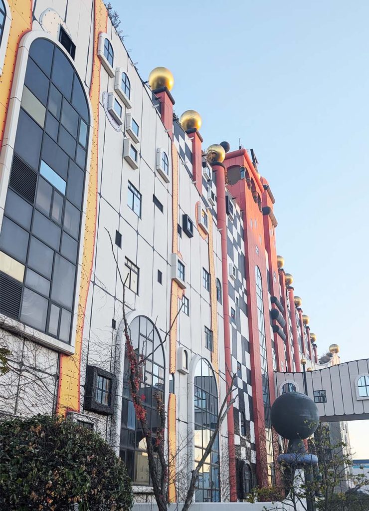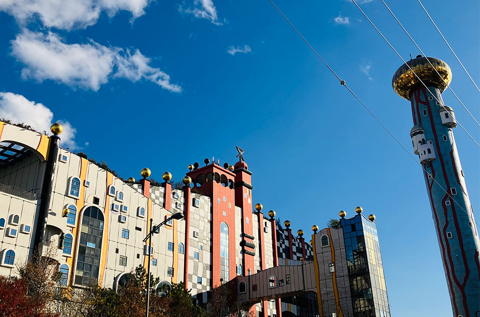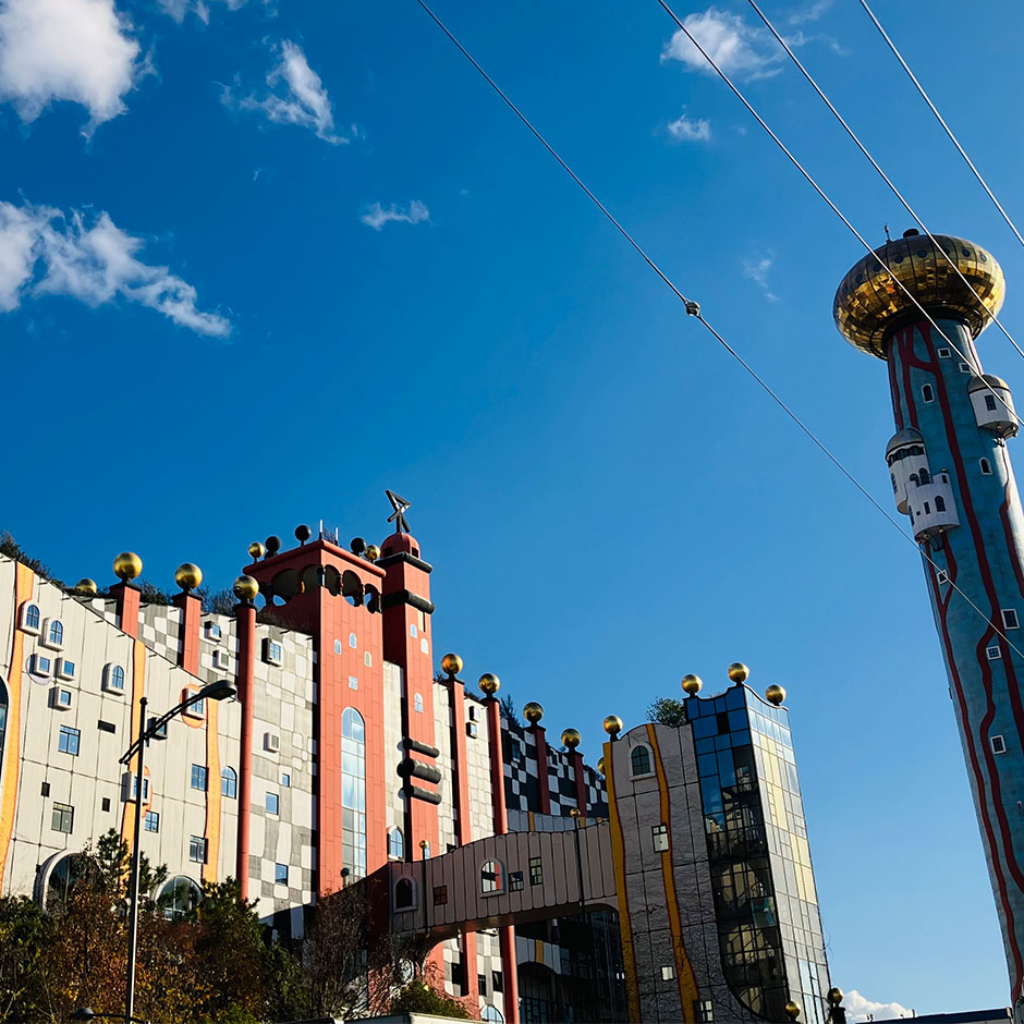 オーストリアの芸術家・フリーデンスライヒ・フンデルトヴァッサーによってデザインされたテーマパークの建物のようにカラフルな見た目が目を引く。