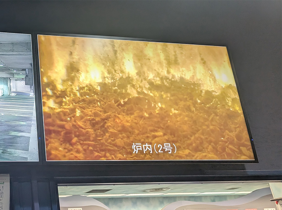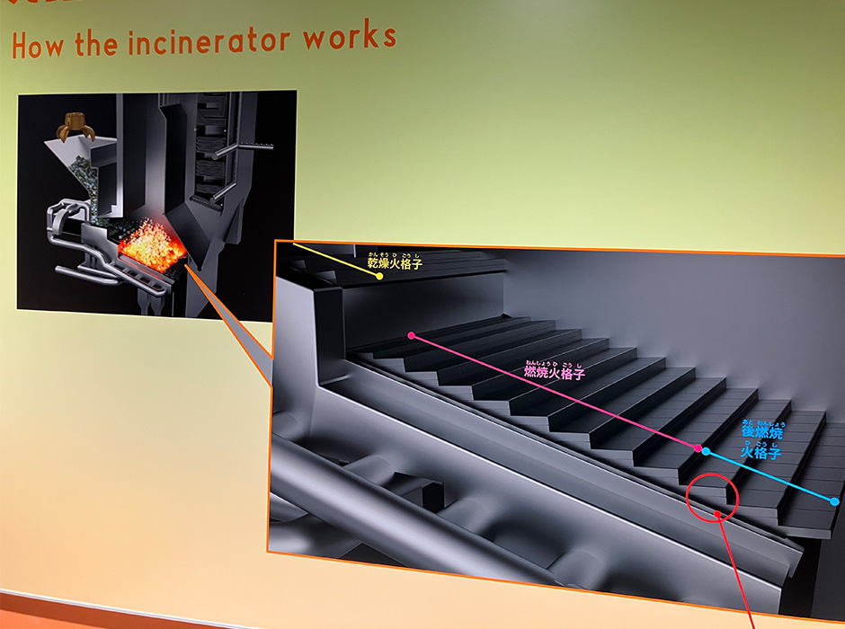 ごみクレーンで焼却炉の投入口(投入ホッパ)にごみが運ばれ、いよいよ焼却炉へと落ちていきます。