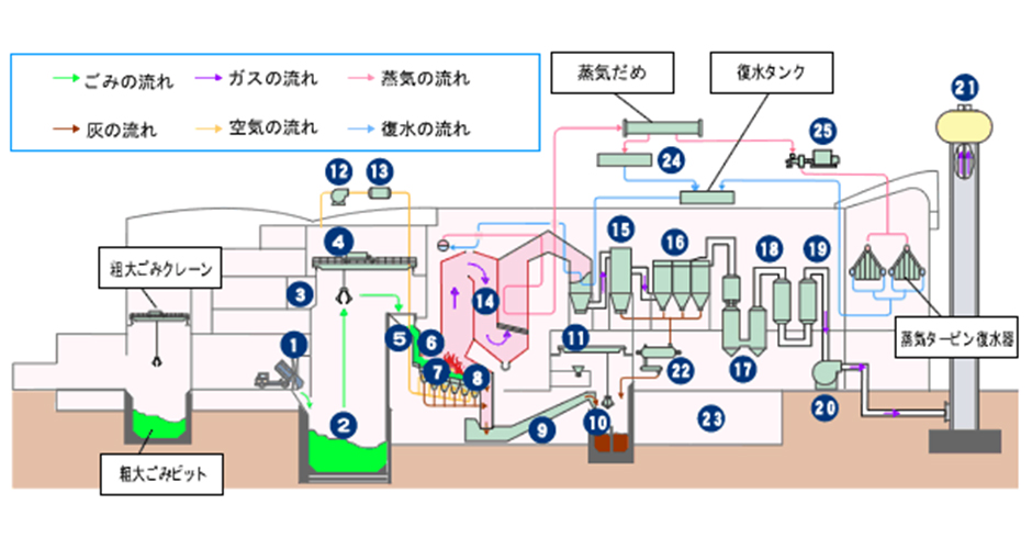 ごみの投入①→ゴミの貯留②→焼却⑥⑦⑧→排出される灰と排ガス、排水の処理⑩⑪,⑭~㉒