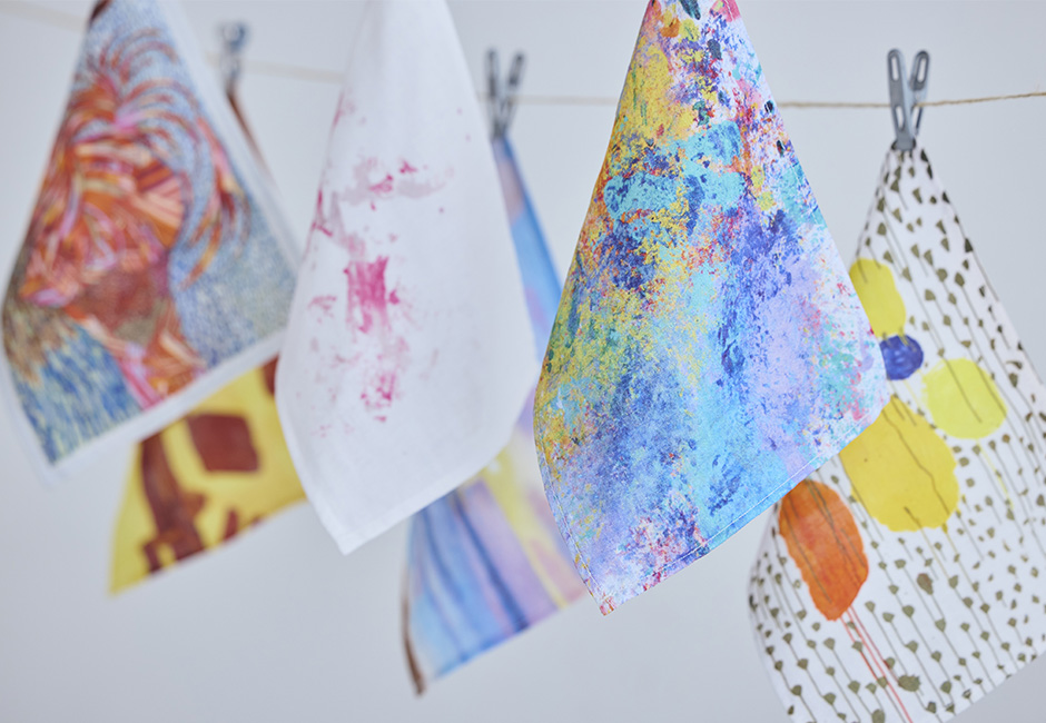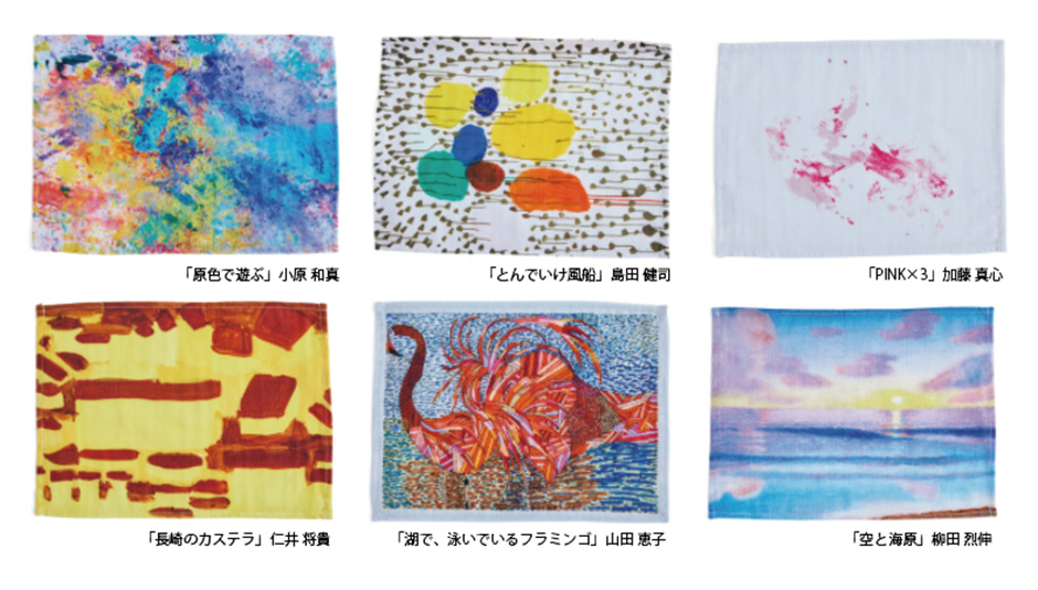 6種あるハンカチにプリントされた作品はすべて、チャレンジド(障がいのある方)の作家たちのものです。