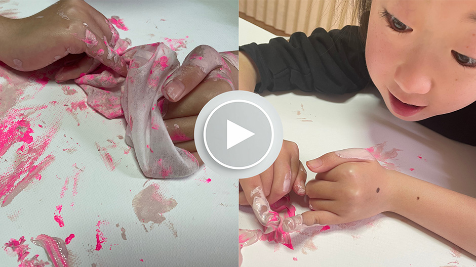キャンバスの上で直接色を指で混ぜ、